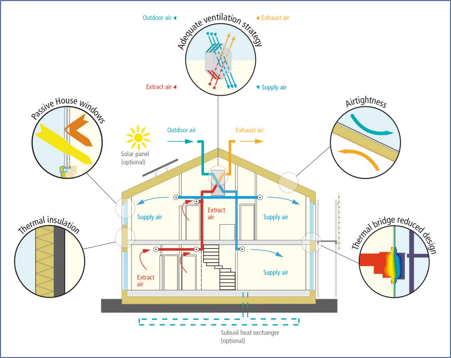 5. Ventilación mecánica con recuperación de calor. Requiere ventilación mecánica con recuperación de calor para reaprovechar la temperatura del aire interior para precalentar o enfriar el aire limpio entrante antes de expulsar el aire viciado al exterior.